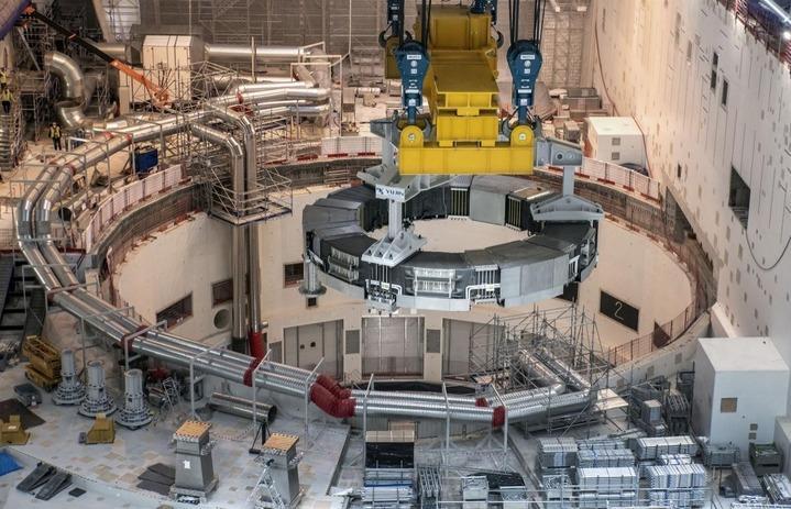 2021年4月,中國研制的PF6超導磁體線(xiàn)圈在法國ITER項目現場(chǎng)吊裝。新華社發(fā)