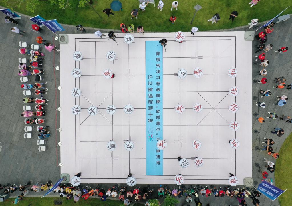 中華文化是兩岸同胞心靈的根脈和歸屬。圖為兩岸青少年傳承象棋文化,促進(jìn)交流(2022年6月12日攝,無(wú)人機照片)。新華社記者 林善傳 攝