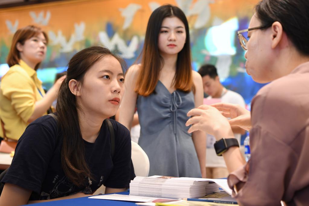近年來(lái),大陸為臺灣青年在大陸發(fā)展持續創(chuàng )造更多便利條件。圖為臺灣青年黃亭瑗(前左)在對接會(huì )上與用人單位招聘人員交流(資料圖片)。新華社記者 姜克紅 攝