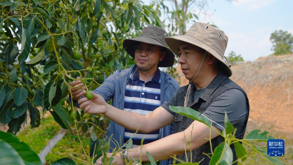 臺商汪志哲(右)在牛油果基地觀(guān)察果實(shí)長(cháng)勢(2023年4月27日攝)。新華社發(fā)(受訪(fǎng)者供圖)