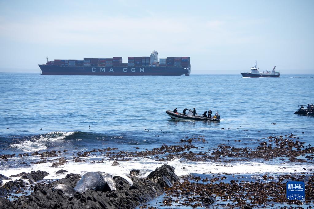 12月9日,在南非開(kāi)普敦,工作人員準備轉移海岸邊的座頭鯨尸體。