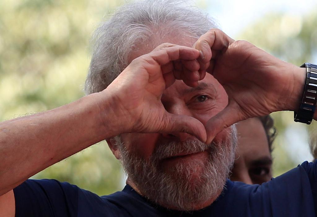 2018年4月7日,在巴西圣貝爾納多-杜坎普的巴西鋼鐵工人工會(huì )總部前,巴西前總統盧拉向支持者致意。(新華社發(fā),拉赫爾·帕特拉索攝)