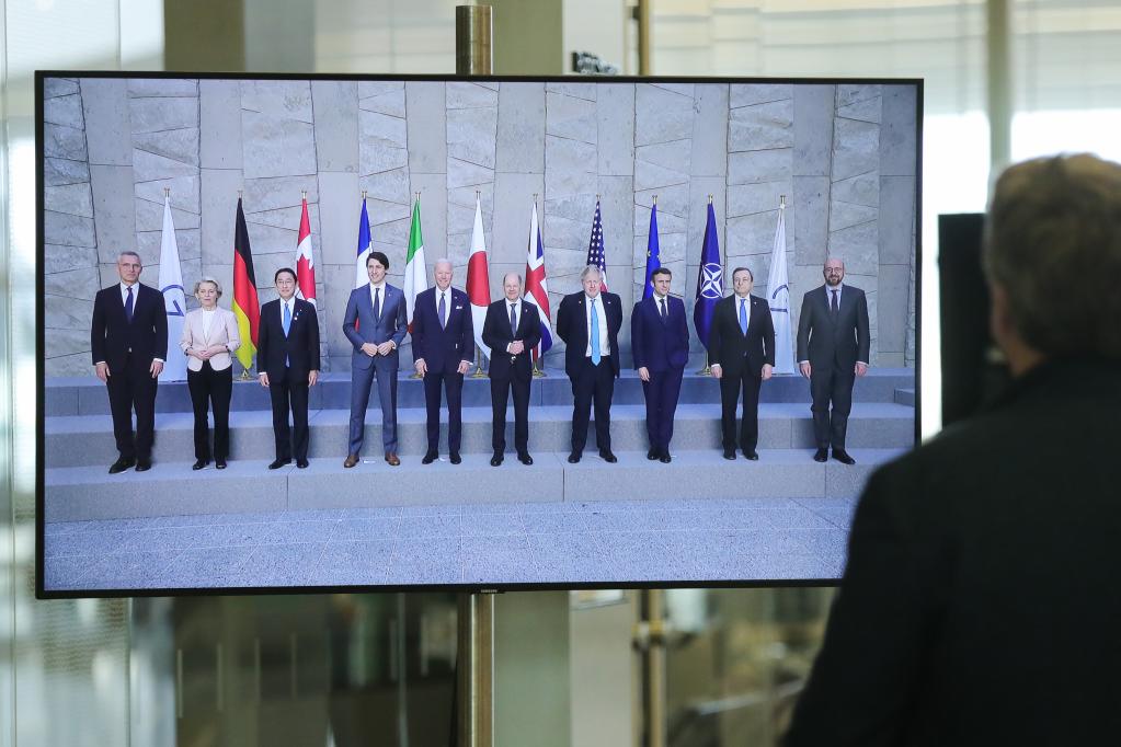 3月24日,在比利時(shí)布魯塞爾北約總部,一名男子觀(guān)看屏幕上七國集團峰會(huì )領(lǐng)導人合影的畫(huà)面。(新華社記者鄭煥松攝)