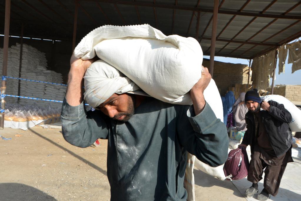 2021年12月20日,人們在阿富汗坎大哈領(lǐng)取世界糧食計劃署提供的援助物資。新華社發(fā)(薩瑙拉攝)