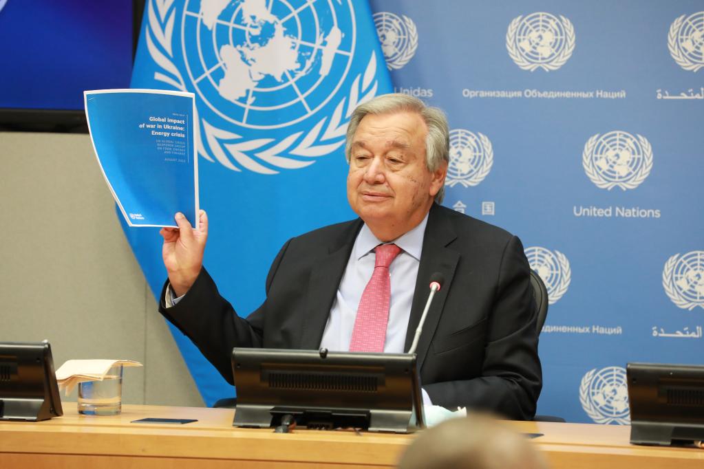 8月3日,在位于紐約的聯(lián)合國總部,聯(lián)合國秘書(shū)長(cháng)古特雷斯出席聯(lián)合國全球糧食、能源和金融危機應對小組第三次報告發(fā)布會(huì )。新華社記者謝鍔攝