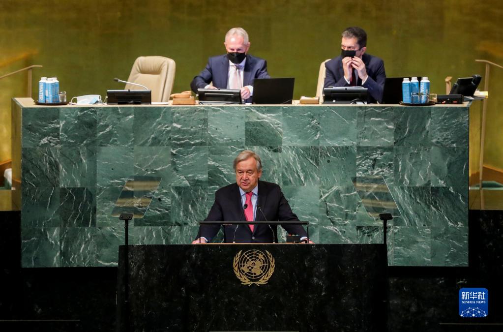 9月20日,在位于紐約的聯(lián)合國總部,聯(lián)合國秘書(shū)長(cháng)古特雷斯(下)在聯(lián)合國大會(huì )一般性辯論開(kāi)幕式上講話(huà)。