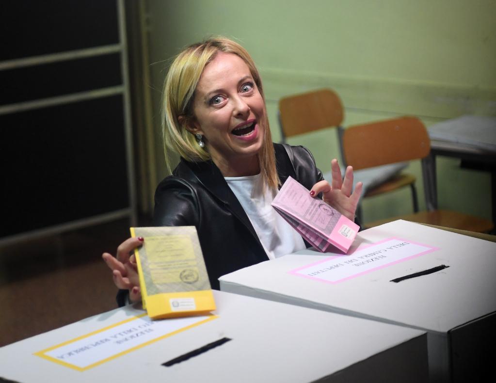 9月25日,意大利兄弟黨黨首喬治婭·梅洛尼在羅馬一處投票站展示選票。新華社記者 金馬夢(mèng)妮 攝