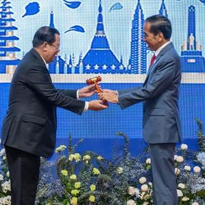 11月13日,在柬埔寨首都金邊,柬埔寨首相洪森(左)將東盟輪值主席木槌移交給2023年?yáng)|盟輪值主席國印度尼西亞總統佐科。