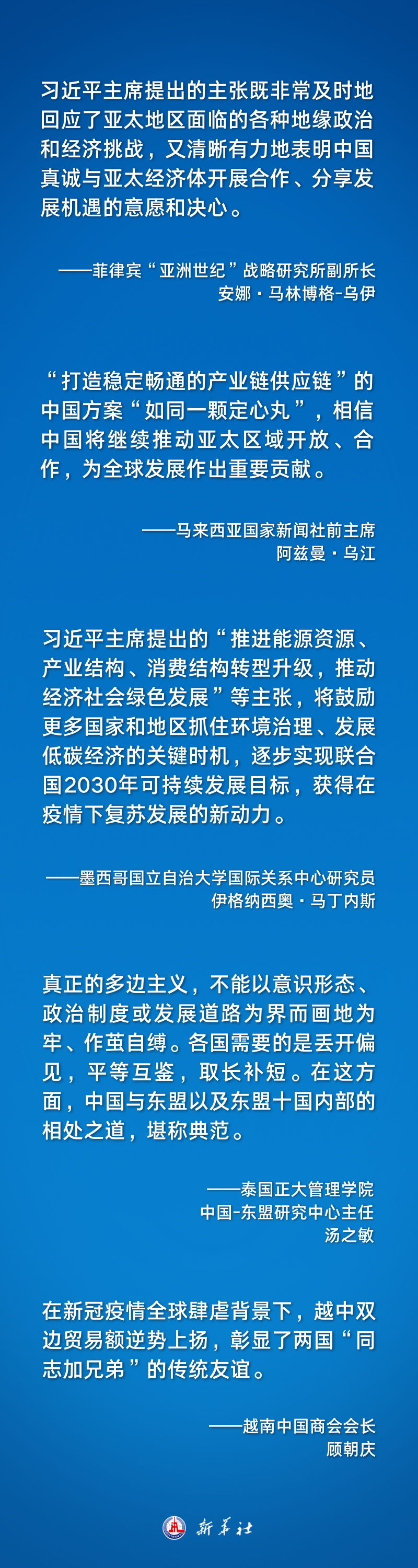 對于亞太未來(lái)發(fā)展繁榮,習近平主席提出重要主張:要攜手構建亞太命運共同體,再創(chuàng )亞太合作新輝煌。多國人士認為,“維護國際公平正義,建設和平穩定的亞太”“堅持開(kāi)放包容,建設共同富裕的亞太”“堅持綠色低碳發(fā)展,建設清潔美麗的亞太”“堅持命運與共,建設守望相助的亞太”為亞太地區未來(lái)發(fā)展指明了方向和路徑。