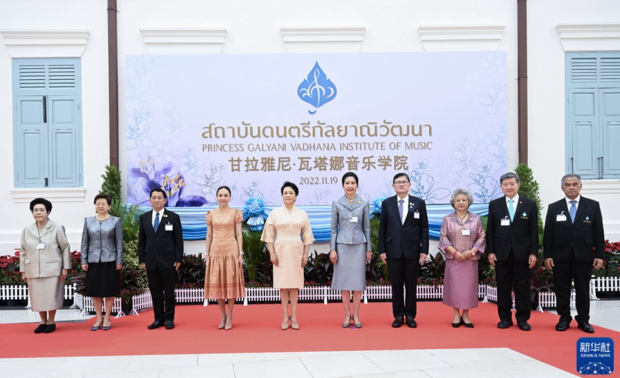當地時(shí)間11月19日上午,國家主席習近平夫人彭麗媛在泰國總理夫人娜拉蓬陪同下參觀(guān)甘拉雅尼音樂(lè )學(xué)院。這是彭麗媛與娜拉蓬等合影。新華社記者 謝環(huán)馳 攝