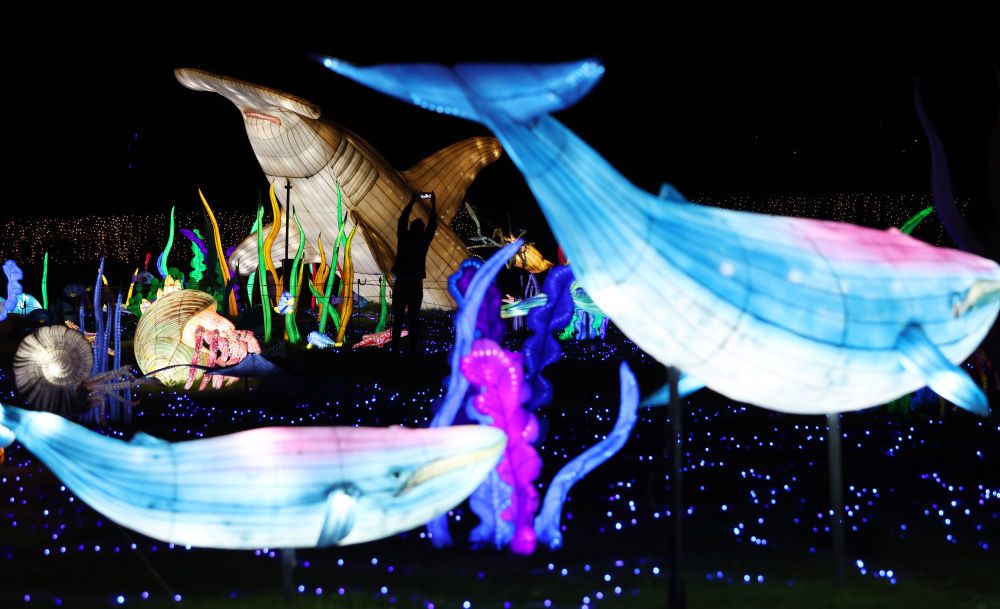 ↑2022年10月26日,在法國巴黎近郊的圖瓦里動(dòng)物園,一名參觀(guān)者在媒體預展上為燈飾拍照。