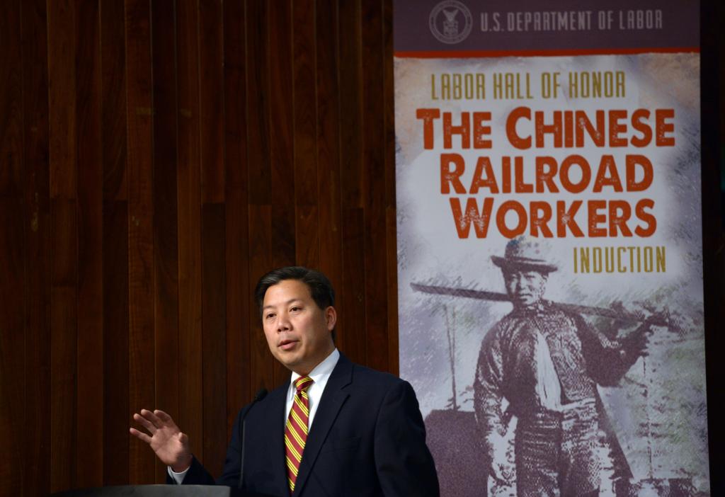2014年5月9日,在華盛頓美國勞工部,時(shí)任美國勞工部副部長(cháng)盧沛寧出席紀念儀式。當日,美國勞工部舉行紀念儀式,正式將19世紀在美國修筑鐵路的1.2萬(wàn)名華工載入其榮譽(yù)榜。新華社記者殷博古攝