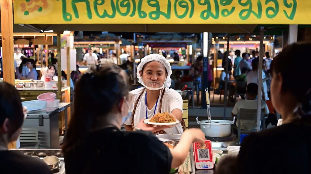 ??诎咨抽T(mén)文創(chuàng )市集于今年6月10日正式開(kāi)業(yè),占地面積約6萬(wàn)平方米,有著(zhù)600余個(gè)小吃與文創(chuàng )攤位。在美食區的300多家小吃商戶(hù)中,160多家小吃由泰國人經(jīng)營(yíng)。