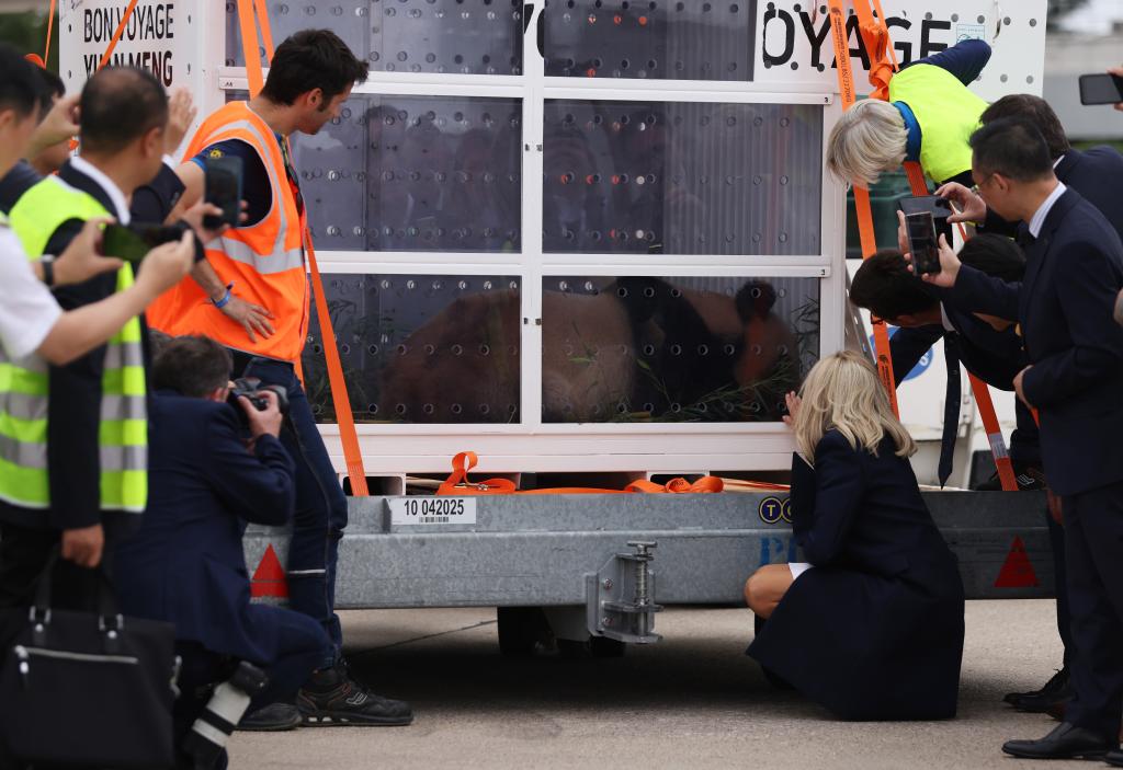 25日下午,天空不時(shí)飄落小雨。戴高樂(lè )機場(chǎng)一個(gè)航空運輸箱前,布麗吉特蹲下,與“圓夢(mèng)”互動(dòng)、道別?!澳芨惺艿剿行┚o張”,布麗吉特說(shuō),她想告訴“圓夢(mèng)”“路上別害怕,有一天我們會(huì )去成都看你”。