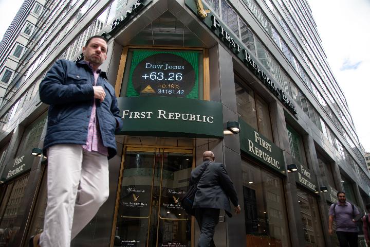 5月1日,在美國紐約,行人從一家第一共和銀行前走過(guò)。(新華社發(fā),郭克攝)