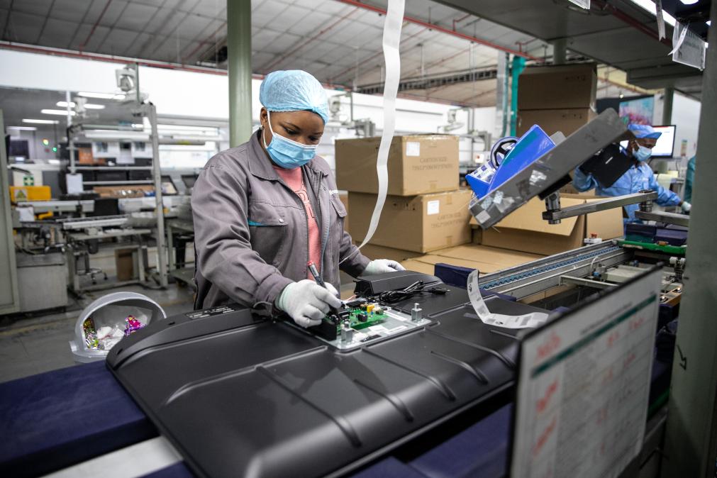 當地員工在南非開(kāi)普敦海信南非工業(yè)園的電視機生產(chǎn)線(xiàn)上工作。