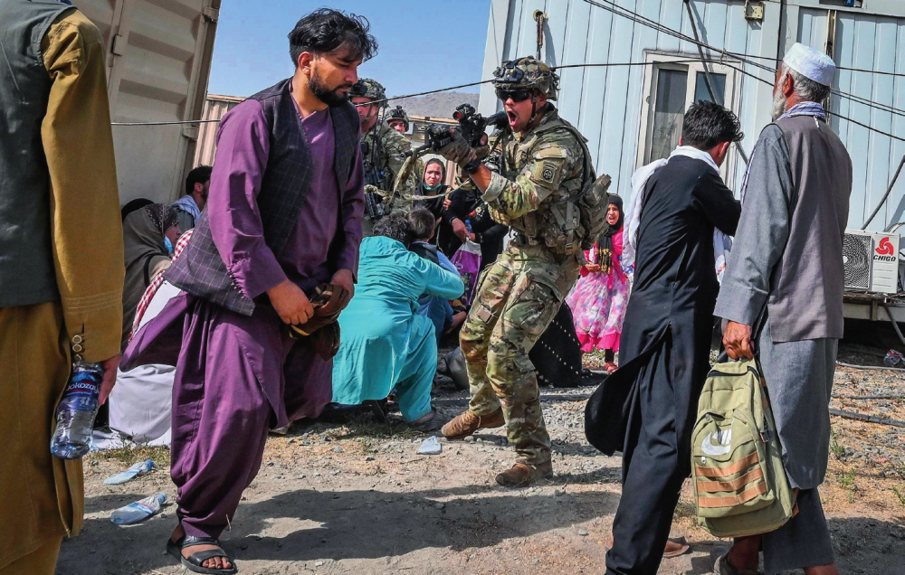 在阿富汗喀布爾機場(chǎng),一名美軍士兵用槍指向一名阿富汗男子(2021年8月16日攝)新華社/法新