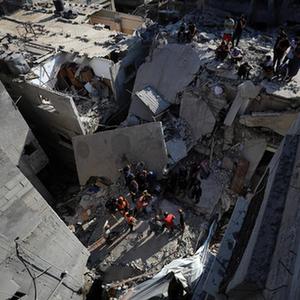 在加沙南部汗尤尼斯一個(gè)被夷為平地的街區,人們在廢墟中不斷挖掘。當11歲的西拉·哈姆丹被人們從破碎的水泥塊中抬出,她的身下還躺著(zhù)9歲的妹妹蒂拉。人們用花床單把兩個(gè)女孩裹起來(lái),送往太平間。